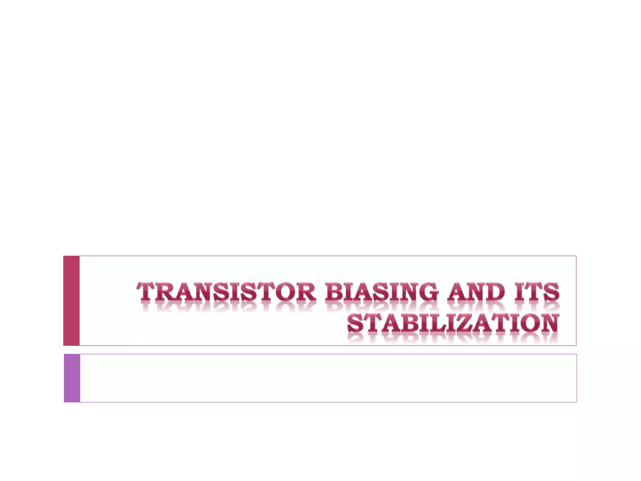This document discusses transistor biasing circuits. It outlines different types of biasing circuits including fixed bias, emitter bias, collector feedback bias, and voltage divider bias. It explains how each circuit works, analyzing key parameters like collector current, collector-emitter voltage, and stability factor. The goal of biasing circuits is to set the transistor's operating point in the active region for faithful signal amplification while stabilizing it against temperature and other variations. Voltage divider bias is highlighted as the most widely used method due to its ability to stabilize the operating point through negative feedback.