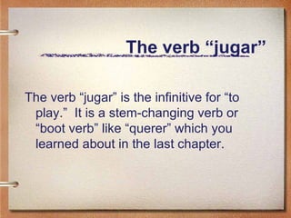 The document discusses the Spanish verb "jugar" and informal commands. It provides the conjugated forms of "jugar" and explains that informal commands are formed using the third person singular form of the verb. Some examples of positive and negative informal commands are given to illustrate how to tell someone to or not to do something in Spanish.
