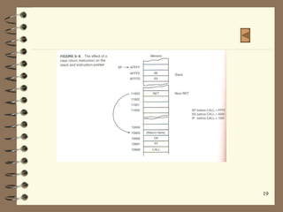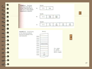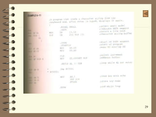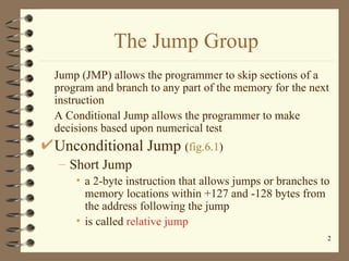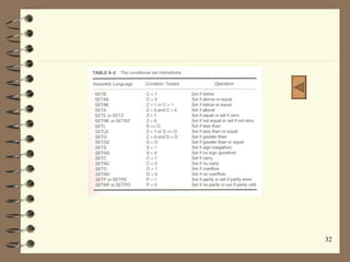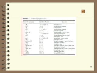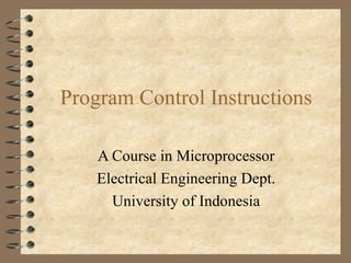 The document discusses different types of program control instructions in microprocessor programming including jumps, conditional jumps, loops, procedures, interrupts, and machine control instructions. It provides examples of how to use jump instructions to transfer program flow, conditional jumps to make decisions, loops to repeat operations, procedures to organize reusable code, and interrupt handling. It also discusses low-level machine instructions for tasks like setting flags and halting the processor.