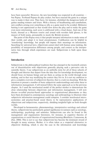 This chapter discusses subjectivism as an alternative to objectivism for providing a theoretical foundation for information management. Subjectivism focuses on human sense-making and interpretation rather than objective truths. The chapter argues that subjectivism fails to address economic value, a key concern for organizations. It suggests combining objectivism and subjectivism into an integrated approach. Subjectivism is illustrated using practice-based social theories, which view social practices as transcending the divide between objectivism and subjectivism. However, differences between the two philosophies remain fundamental.