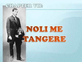 This document provides context and details about Jose Rizal's novel Noli Me Tangere. It summarizes that 1886 was a painful but joyful time for Rizal as he was sick in Berlin but his novel was published in 1887. It inspired by Uncle Tom's Cabin, Rizal began writing Noli Me Tangere in 1884 to depict the suffering of Filipinos under Spanish rule. The document lists locations and time periods when he wrote parts of the novel and individuals who helped publish it. It provides an overview of characters in Noli Me Tangere and notes some are based on real people from Rizal's life.