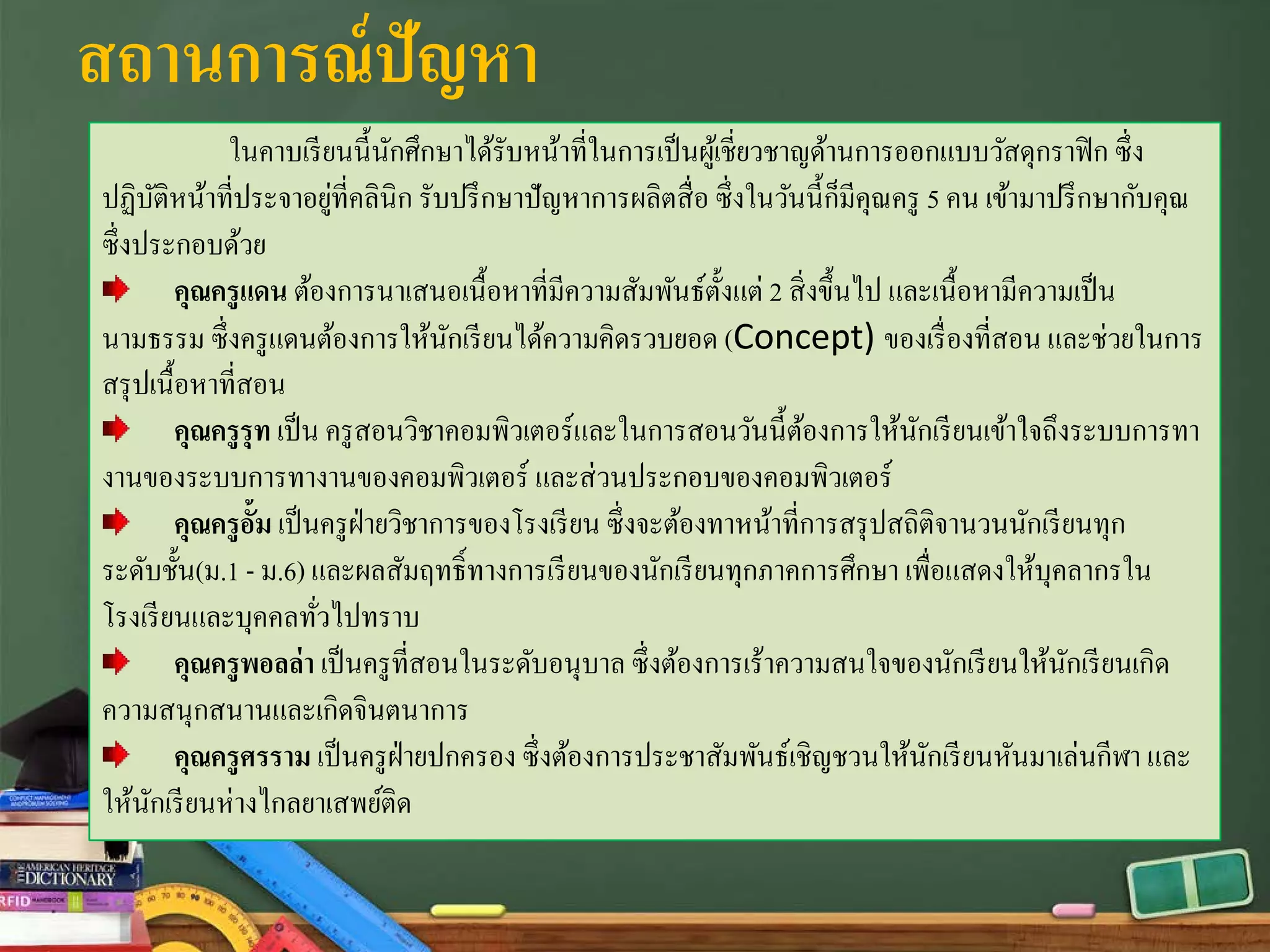 คุณครูรุท เป็น ครูสอนวิชาคอมพิวเตอร์และในการสอนวันนี้ต้องการให้นักเรียนเข้าใจถึงระบบการทา