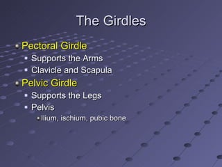 The document summarizes the bones that make up the appendicular skeleton, which includes the pelvis and limbs. It describes the bones that make up the pectoral girdle (shoulder), pelvic girdle, upper limb (arm), lower limb (leg), wrist, hand, and foot. Key bones discussed include the clavicle, scapula, humerus, radius, ulna, femur, tibia, fibula, and bones of the feet. It also briefly discusses common fractures.