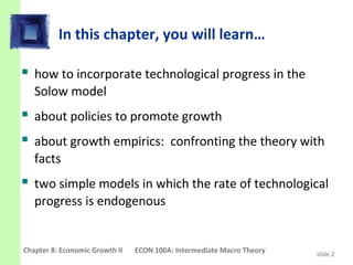 This document discusses economic growth and technological progress. It begins by introducing the Solow growth model and its limitations in accounting for long-run growth. The chapter then incorporates technological progress into the Solow model by including labor-augmenting technological change. It discusses how this affects the model's predictions and steady states. Later sections examine empirical evidence on growth, including balanced growth, conditional convergence between countries, and the roles of capital accumulation and productivity in determining income differences. The chapter concludes by considering how policies like free trade may impact productivity and long-run growth.
