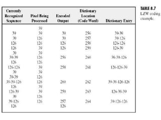 Image compression involves reducing the size of image files to reduce storage space and transmission time. There are three main types of redundancy in images: coding redundancy, spatial redundancy between neighboring pixels, and irrelevant information. Common compression methods remove these redundancies, such as Huffman coding, arithmetic coding, LZW coding, and run length coding. Popular image file formats include GIF, JPEG, PNG, DICOM, SVG, and TIFF, which use different compression techniques and metadata standards depending on the image type and use.