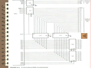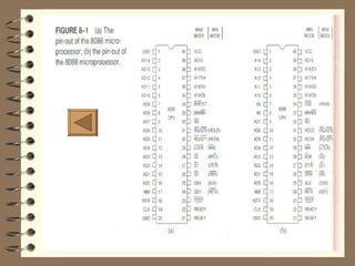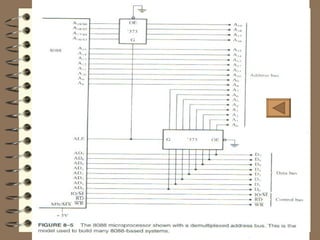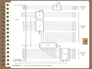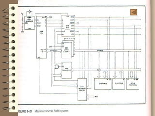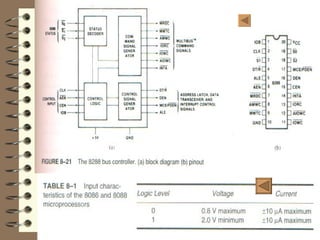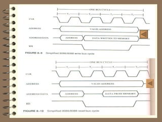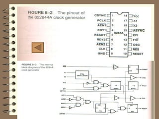 The document discusses the hardware specifications of the Intel 8086 and 8088 microprocessors. It describes the differences in their data bus widths and a minor difference in one control signal. Both require a 5V power supply. It also provides details on the pin connections and functions of the clock generator chip 8284A used with these microprocessors. The document explains bus buffering, demultiplexing, timing and the use of wait states for interfacing with slower memory and I/O components. It contrasts the minimum and maximum operating modes of the 8086/8088 and the need for an external 8288 bus controller in maximum mode.
