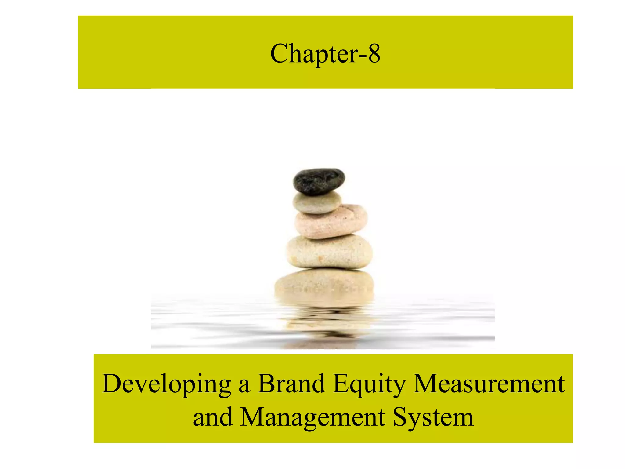 The document discusses developing a brand equity measurement and management system. It outlines the brand value chain model which assesses sources and outcomes of brand equity through various stages from marketing investments to customer mindset to market performance to shareholder value. Multipliers like program quality and market dynamics can impact how value moves through the chain. The document recommends conducting brand audits and tracking studies over time. A brand equity management system includes a brand equity charter that defines the brand vision, measurement procedures, and guidelines for marketing programs. It also includes regular brand equity reports and responsibilities to maximize long-term brand value.