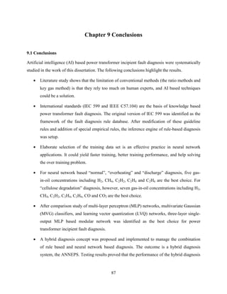 This chapter provides conclusions and summaries from a dissertation on artificial intelligence techniques for power transformer fault diagnosis. The key conclusions are that rule-based and neural network approaches each have limitations that a hybrid model addresses better, and a specific hybrid system called ANNEPS was developed that integrates rule-based diagnosis with a multi-layer perceptron neural network. The chapter also outlines contributions, such as developing the ANNEPS system, and proposes areas for future work such as integrating additional fault diagnosis functions.