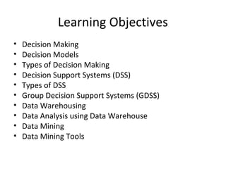 Decision support systems (DSS) are interactive computer-based systems that help managers solve structured, semi-structured, and unstructured decision problems. DSS use data warehouses to store integrated data from multiple sources and allow users to analyze and visualize the data. Data mining tools can then be used to discover patterns in large datasets and predict future trends to help managers make strategic decisions.