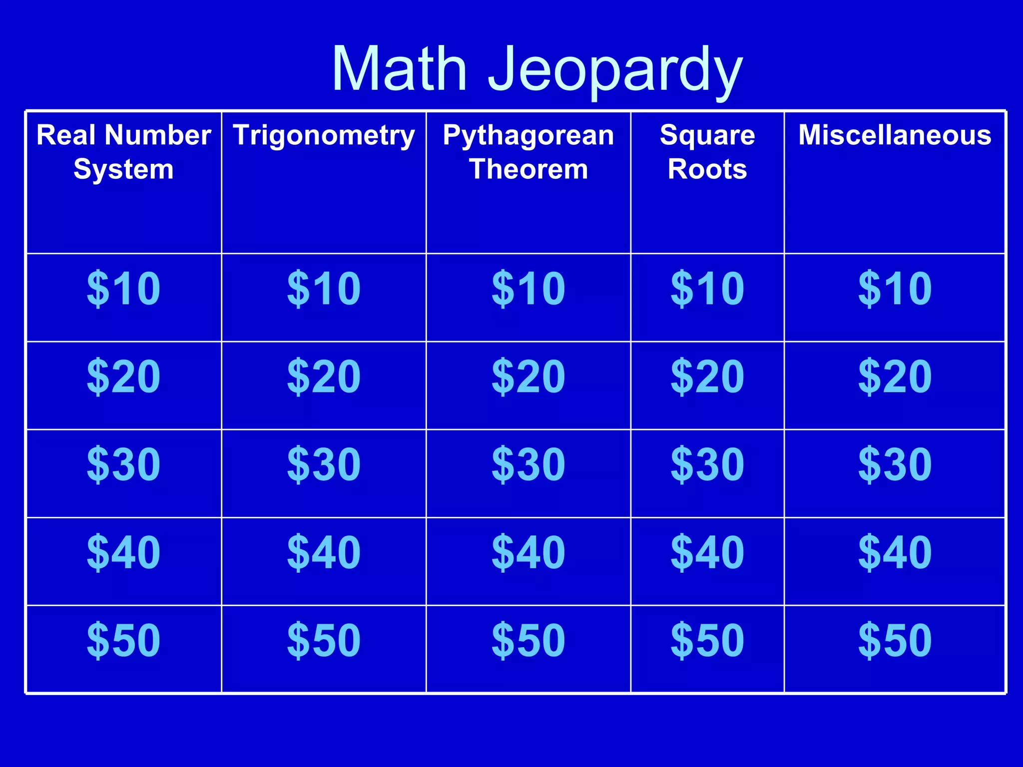 This document contains a Math Jeopardy game with questions in various categories including real number systems, trigonometry, square roots, and the Pythagorean theorem. The questions range in difficulty from $10 to $50 and cover topics like classifying numbers, solving trigonometric ratios, using the Pythagorean theorem to find missing sides of right triangles, and more.