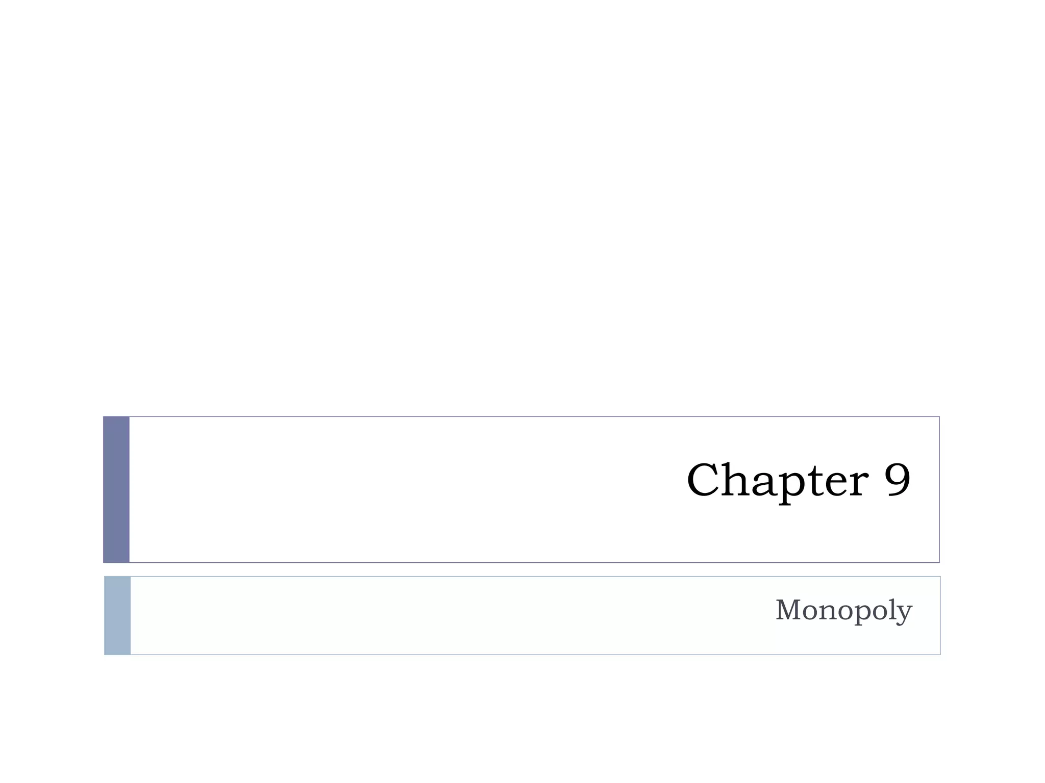 A monopoly is characterized by a single seller, a unique product with no close substitutes, and high barriers to entry that make it difficult for competitors to enter the market. A monopolist is a price maker that faces a downward sloping demand curve and sets price and quantity such that marginal revenue equals marginal cost to maximize profits. This results in the monopoly quantity being lower and price being higher than under perfect competition, creating inefficiencies like deadweight loss and redistributing wealth from consumers to the producer.