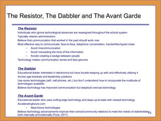 It also provides statistics on student tech access and use, notes benefits and cautions of email communication, and discusses developing an Acceptable Use Policy and using technology for instructional purposes like distance learning and interactive whiteboards.