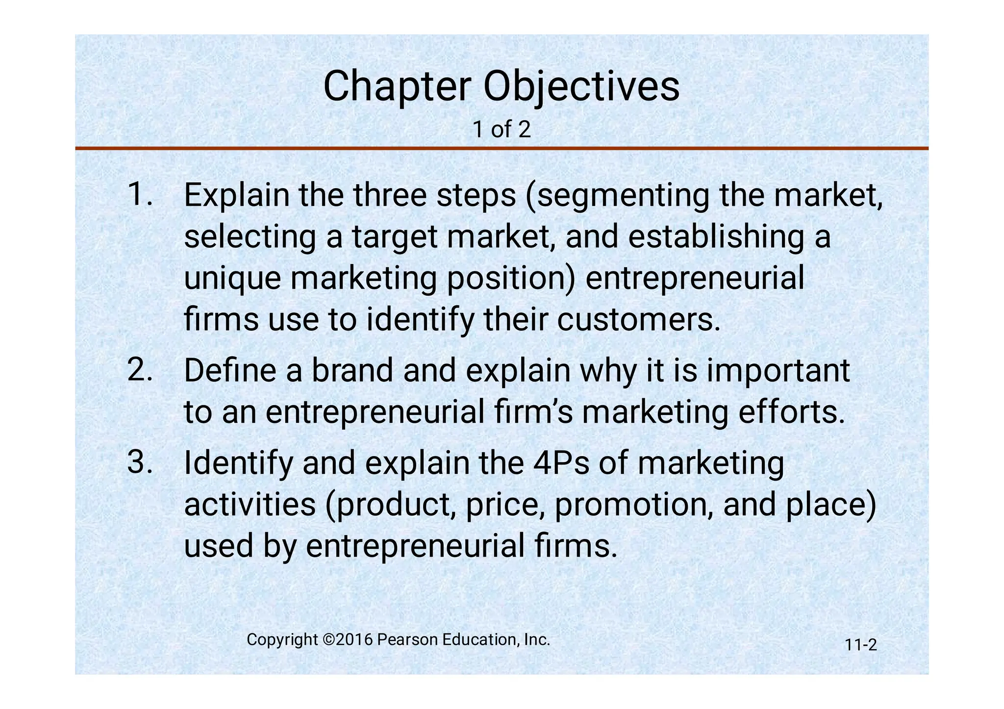 The document discusses marketing issues unique to entrepreneurial firms. It covers three key steps in selecting a target market: segmenting the market, choosing a target segment, and establishing a unique positioning within that segment. It also defines branding and the importance of a brand for entrepreneurs. Finally, it outlines the four Ps of marketing - product, price, promotion, and place - that entrepreneurial firms use.