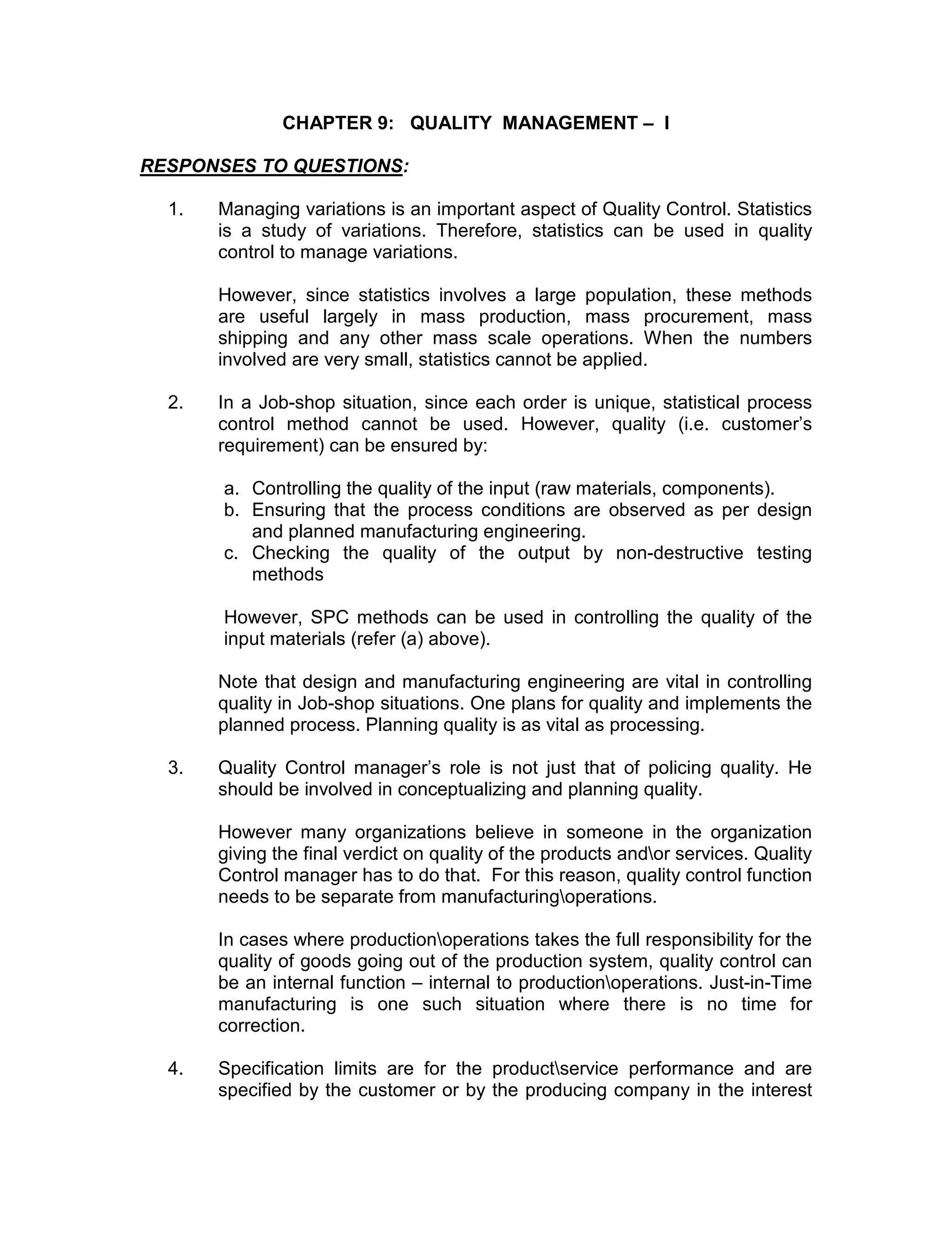 1. Statistical process control (SPC) methods are useful for mass production but not for job shop production where each product is unique. Quality in job shops can be ensured by controlling input quality, process conditions, and output quality checks.