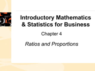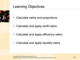 The document provides an overview of ratios and proportions in relation to business mathematics, including methods to calculate and apply profit, efficiency, and liquidity ratios. It explains the definitions and significance of ratios, proportions, and related financial metrics such as total asset turnover, stock turnover, and liquidity ratios like current-asset and acid-test ratios. Additionally, it emphasizes how these ratios help assess a company's financial position, operational efficiency, and ability to meet obligations.