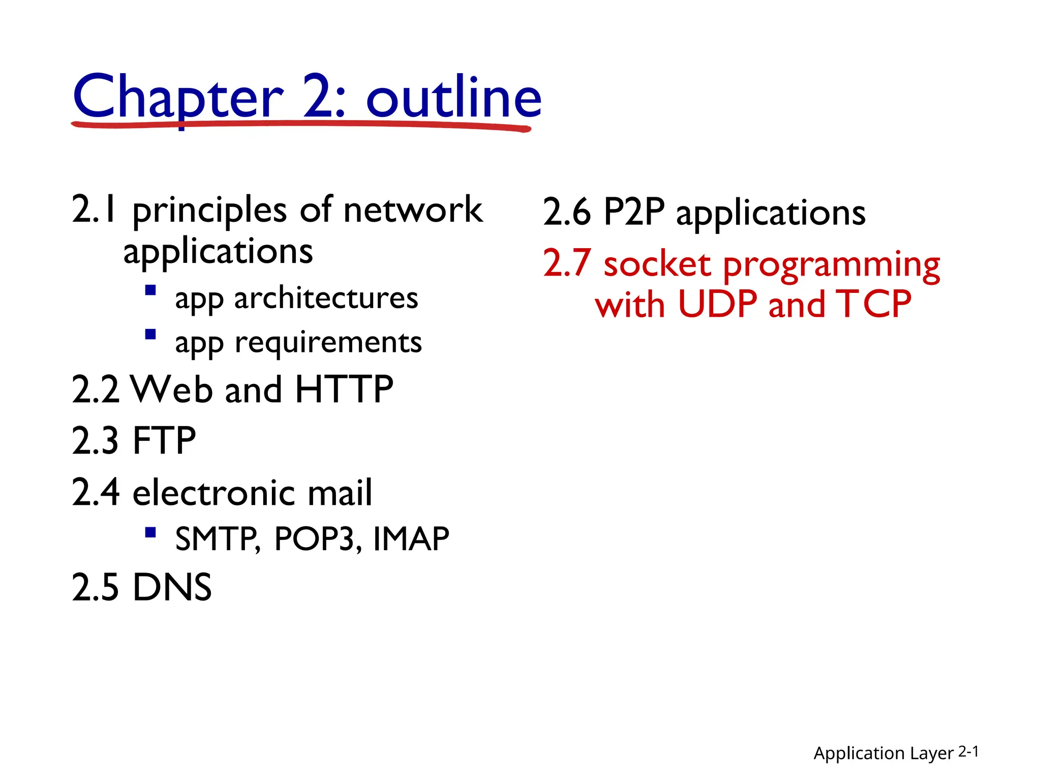 The document outlines the principles of network applications, covering architectures, requirements, and protocols such as HTTP, FTP, SMTP, POP3, IMAP, DNS, and P2P applications. It provides details on socket programming using both UDP and TCP, demonstrating client-server interaction and how data is transmitted and processed. Example applications in Python for both UDP and TCP protocols are also presented to illustrate socket creation, data sending, and receiving mechanisms.