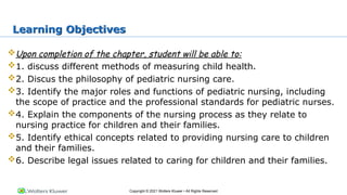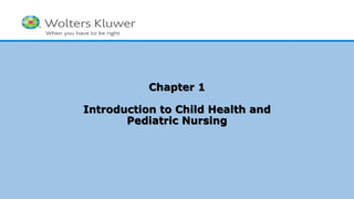 The document provides an introduction to child health and pediatric nursing, detailing the evolution of child health care, definitions of health, and the core principles guiding pediatric nursing. It outlines the roles and responsibilities of pediatric nurses, the importance of family-centered and culturally competent care, and the ethical considerations involved in nursing practice. Key milestones and current standards of practice are also highlighted, along with discussions about morbidity, mortality, and health education aimed at improving outcomes for children and their families.