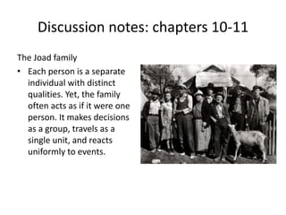 The document summarizes chapters 10-11 of the novel. As the Joad family transitions from farm life to becoming migrant workers, their habits, customs, and leadership structure change. Grandpa refuses to leave his land. Ma gradually takes over leadership of the family from Pa as they journey together. The family acts as a single unit and makes decisions as a group. Experience on the road transforms the Joads, with the older generation giving way to the new, and Ma emerging as the undisputed leader who holds the family together through their difficulties.