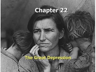 The document discusses the Great Depression and President Franklin D. Roosevelt's New Deal programs to address it. It provides background on the causes of the Depression, including outdated industries, farm issues, easy credit, and unequal income distribution. Roosevelt implemented relief programs like the CCC and WPA to provide jobs as well as the FDIC, SEC, Social Security, and other "alphabet soup" programs for financial reform and relief for those in need. His policies aimed to provide financial reform, relief, and economic recovery from the Depression.