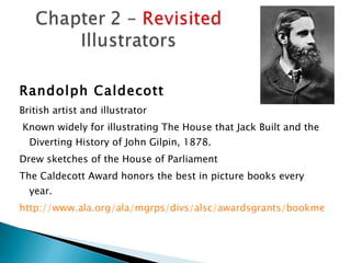 1. The document discusses Randolph Caldecott, a British artist and illustrator known for works like The House that Jack Built and John Gilpin.