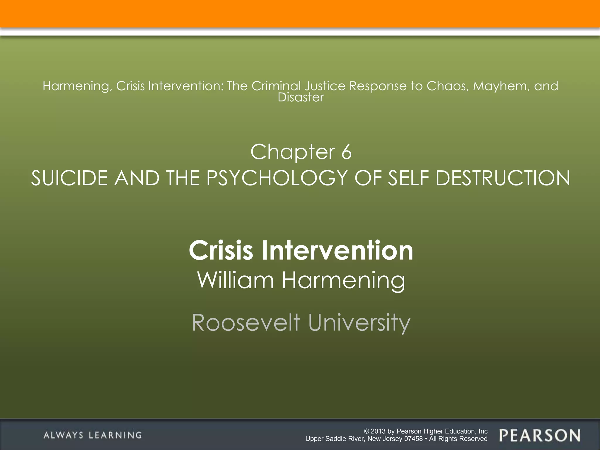 The document summarizes chapter 6 of the book "Crisis Intervention: The Criminal Justice Response to Chaos, Mayhem, and Disaster" by William Harmening. The chapter discusses suicide and the psychology of self-destruction. It covers the social impact of suicide in America, predominant theories of suicide, a typology scheme for different types of suicide and the dangers they pose, and techniques for responding to and de-escalating suicide situations. The chapter objectives are to summarize these topics.
