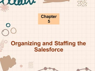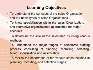 The document discusses organizing and staffing the salesforce. It covers key concepts like the basic types of sales organizations, specialization within sales organizations, determining optimal salesforce size, and the major stages of the salesforce staffing process. The stages discussed are planning, recruiting, selecting, hiring, socialization, and assimilation. Planning involves determining the number and type of salespeople needed. Recruiting involves finding internal and external candidates. Selection methods include screening resumes, interviews, testing, and reference checks. Hiring offers candidates jobs and socialization helps new hires adjust to the company culture.