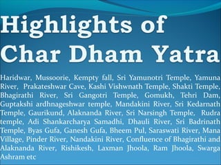The Char Dham Yatra is a popular Hindu pilgrimage that involves visiting four holy shrines located in the Himalayan region of India. Over 5 lakh tourists visit these sites each year to attain salvation. The four sites - Yamunotri, Gangotri, Kedarnath, and Badrinath - are located in scenic mountains surrounded by snow and are believed by Hindu mythology to have been established by the philosopher Adi Shankaracharya.