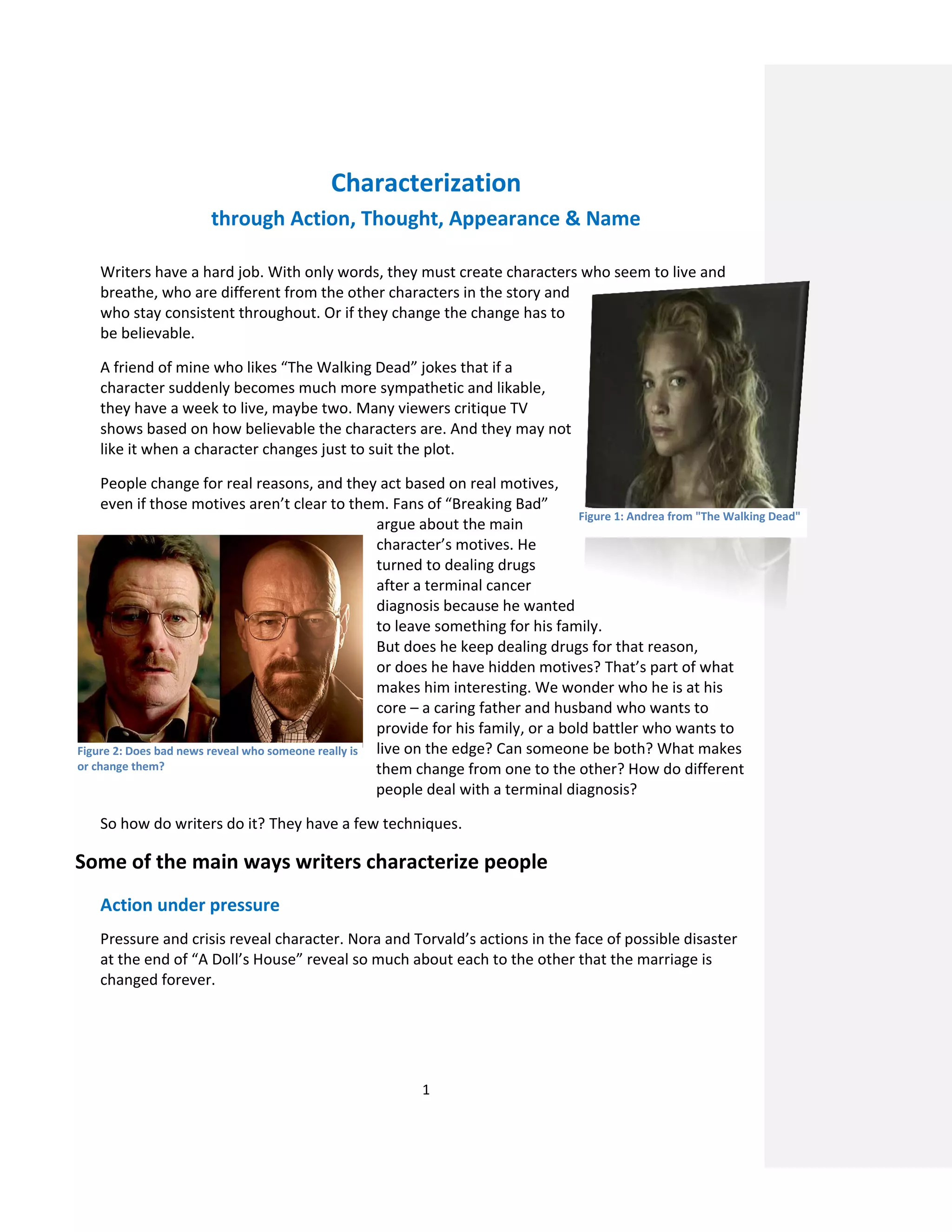 This document discusses various techniques writers use to characterize characters in their stories. It examines how characters are characterized through their actions, thoughts, appearances, and names. Specific examples are provided from works like "A Doll's House", "The Walking Dead", "Breaking Bad", and short stories by Flannery O'Connor to illustrate how small or large actions, thoughts revealed through dialogue or narration, physical appearance, and meaningful names can help readers understand and identify characters. The document suggests readers pay attention to these elements to gain insights into characters as they read.
