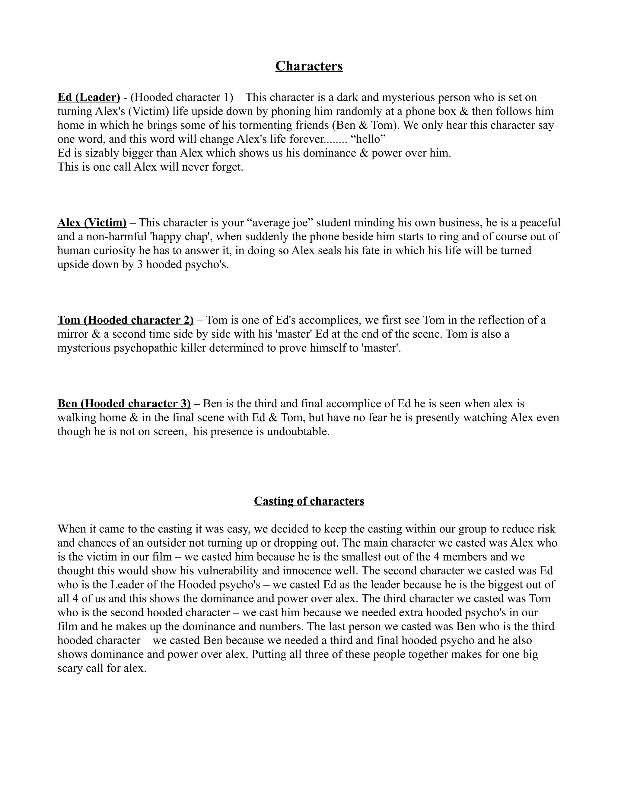 For the film, the group cast themselves in the roles. The smallest member, Alex, was cast as the victim to emphasize his vulnerability. Ed, the largest, was cast as the leader to show power over Alex. Tom and Ben filled out the remaining hooded roles to complete the intimidating trio and demonstrate dominance over Alex.