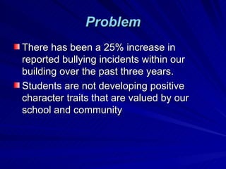 The document proposes implementing a character education program to address an increase in bullying incidents at a high school. The program would establish a character education committee to develop goals and strategies. These include decreasing reported bullying by 30% over two years by integrating character traits into the curriculum. The committee and teachers would collaborate to assess implementation and progress towards goals.