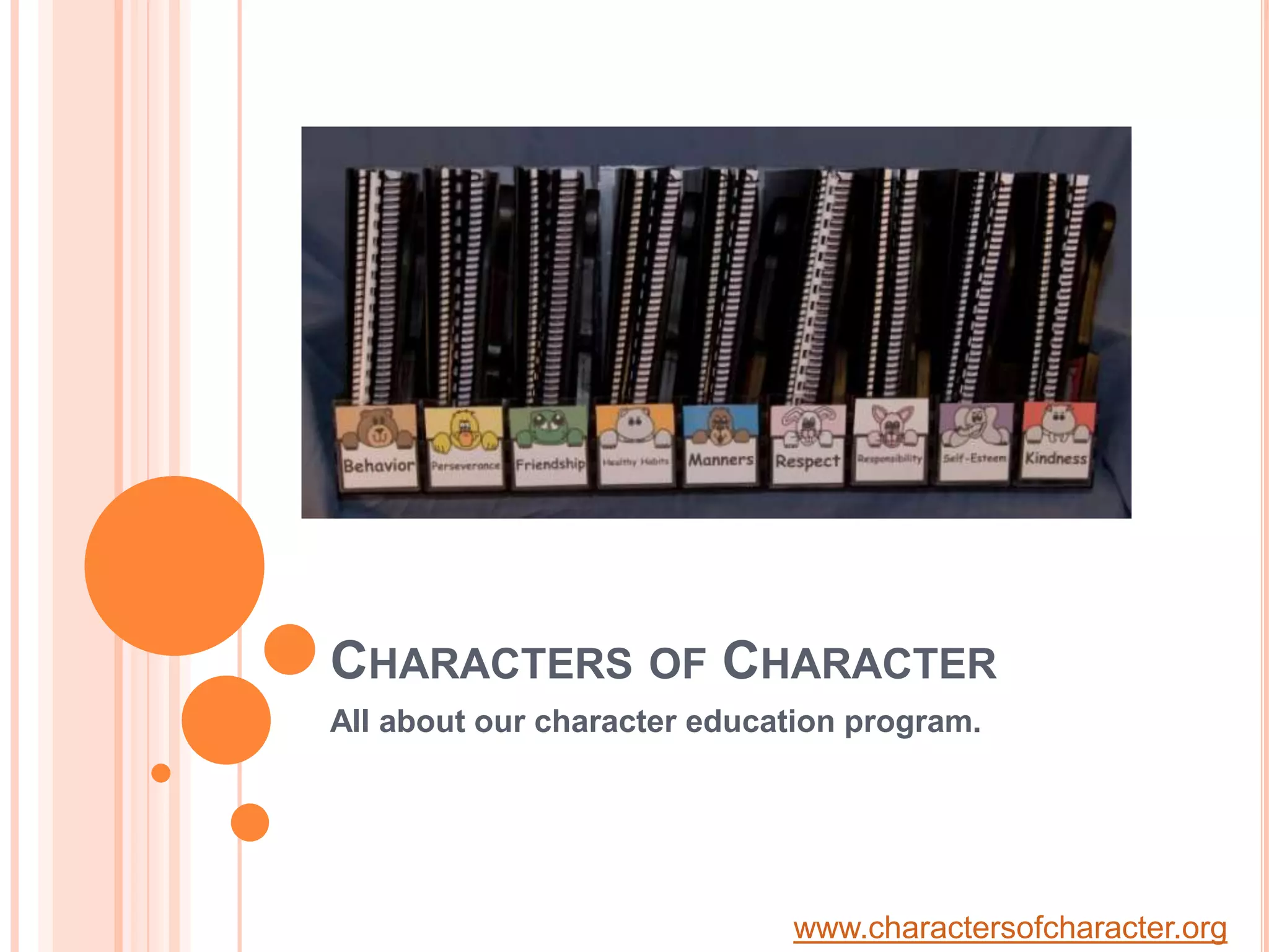The Characters of Character program offers a character education curriculum focused on essential traits like respect, responsibility, and kindness, designed to engage children through relatable characters. The program provides adaptable resources for educators, including handbooks, posters, wooden cutouts, and social stories, all aimed at promoting positive behavior and effective classroom management. It is low-cost and requires minimal training, allowing for seamless integration into existing lesson plans.