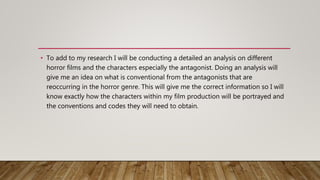 The document explores character and narrative analysis in horror films, focusing on Propp's character theory, which categorizes narrative roles such as hero, villain, and donor, while examining their functions within the story. It further discusses Todorov's narrative structure theory, which outlines stages such as equilibrium and disequilibrium, using examples from films like 'Insidious' and 'Sweeney Todd'. Additionally, it touches on Levi-Strauss's theory of binary opposites and Barthes's five narrative codes that contribute to audience engagement.
