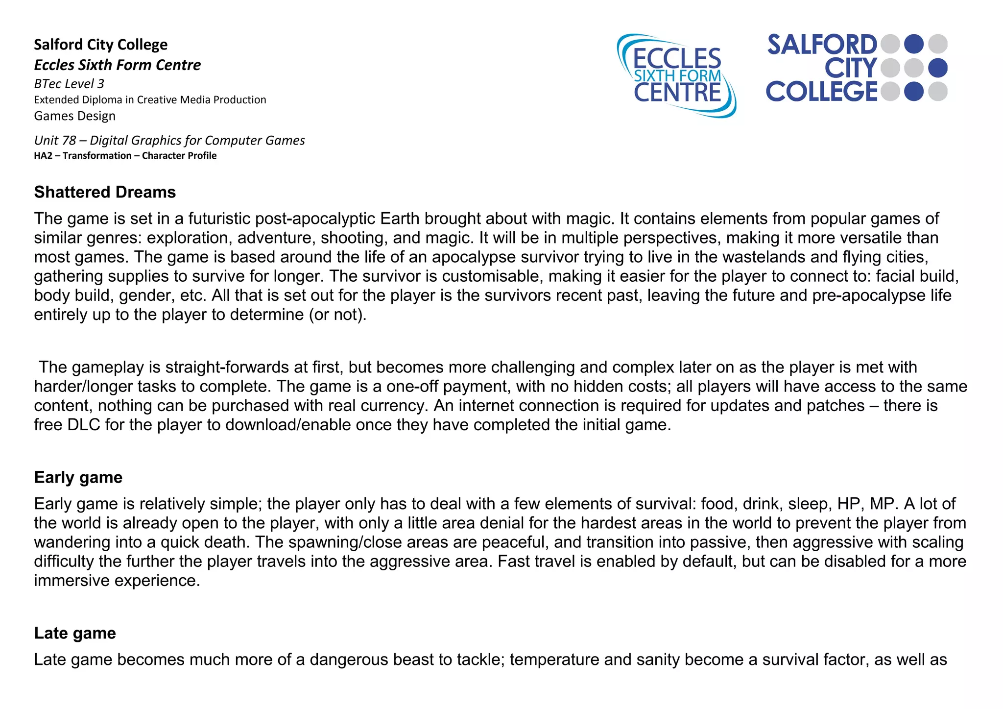 The document describes a game titled 'Shattered Dreams,' set in a post-apocalyptic world featuring customizable characters and multiple gameplay perspectives. Players control a survivor navigating a dangerous environment while managing survival elements, with gameplay complexities increasing over time. The game requires a one-time payment and offers free DLC after completion, emphasizing player choice throughout the experience.