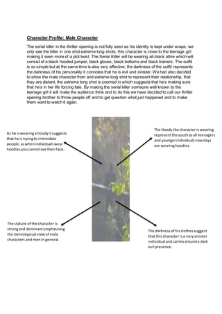 The serial killer's identity is concealed at first, shown only in extreme long shots to keep him mysterious. He wears all-black clothing - a black hooded jumper, gloves, bottoms, and trainers - to appear sinister and evil. The extreme long shots of him suggest he is forcing his way into the teenage girl's life from a distance. Revealing the serial killer to be someone close to the girl, like a brother, is intended to surprise the audience and make them want to rewatch to understand what happened. The hooded jumper helps intimidate and conceal his face, representing youth culture. His dark clothing suggests he is a sinister individual who carries an evil presence. His strong, dominant stature emphasizes stere