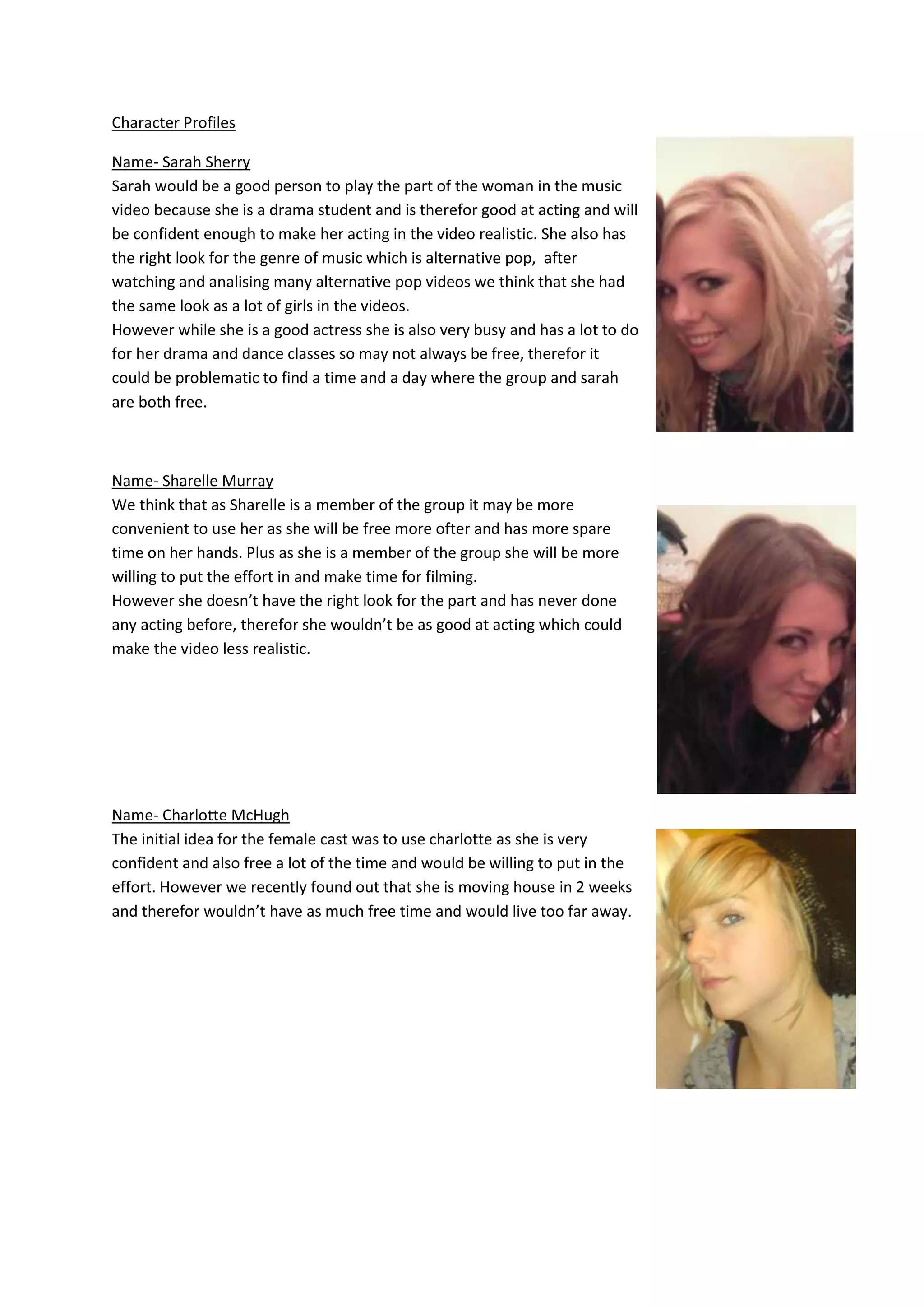 Sarah would be well-suited to play the woman in the music video due to her drama experience and alternative pop look. However, her busy schedule with classes may make scheduling difficult. Sharelle has more availability as a group member but lacks acting experience and the right look. Charlotte was initially considered but recently moved, limiting her availability and proximity.