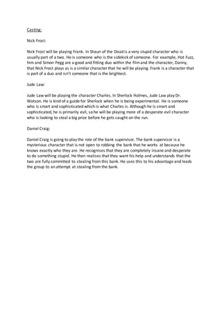 1) The document profiles three main characters - Frank, Charles, and the Bank Supervisor - for an asylum escape and bank heist story.