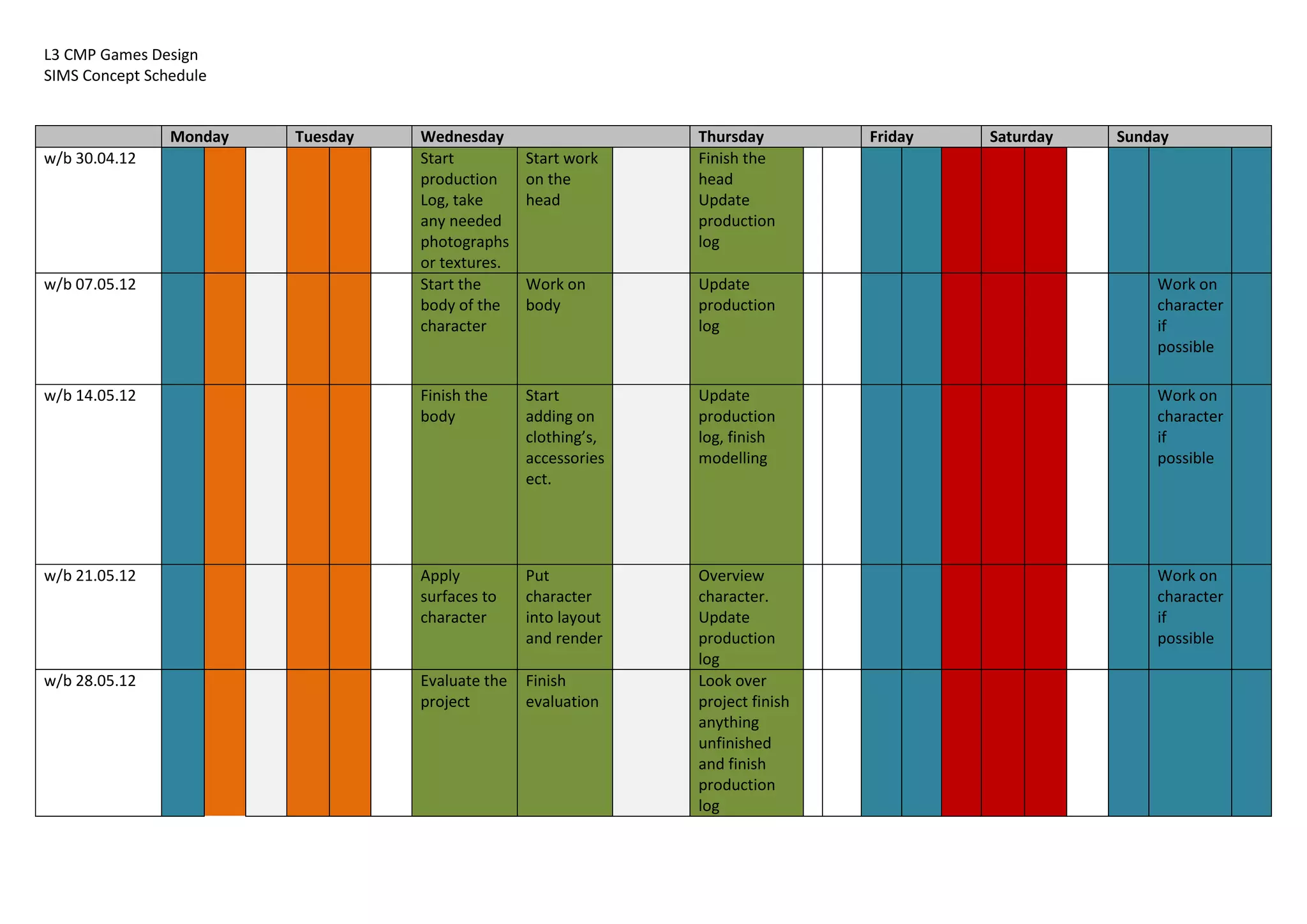 This schedule outlines the process for developing a 3D character model over 5 weeks from April 30th to June 4th. It includes tasks such as starting production logs, photographing textures, modeling the character's body and accessories, applying surfaces, rendering the character, and evaluating the project. The schedule breaks down each week's work, with modeling tasks occurring on weekdays and additional work optional on weekends. Review sessions and updates to the production log are built in to track progress.