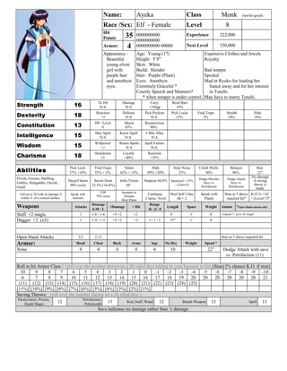 Ayeka is an 8th level elven monk who serves as a princess. She has several magical items and abilities including flying tree/boat Ryo-oki that can transform between forms, and two wood golem guardians named Azaka and Kamidake that obey her orders. However, her orders can be countermanded by the king or queen to prevent her from abusing her power due to her spoiled nature.