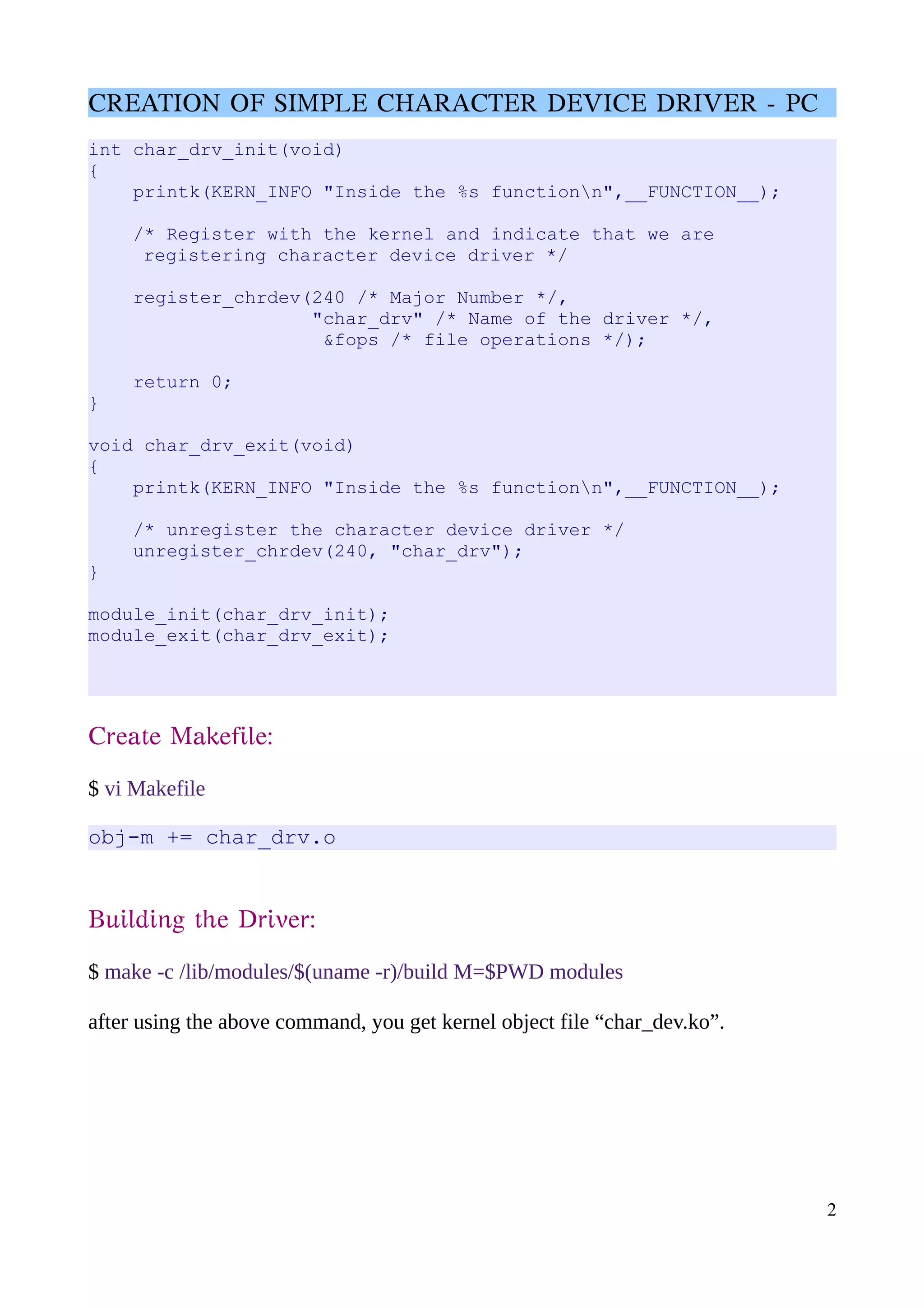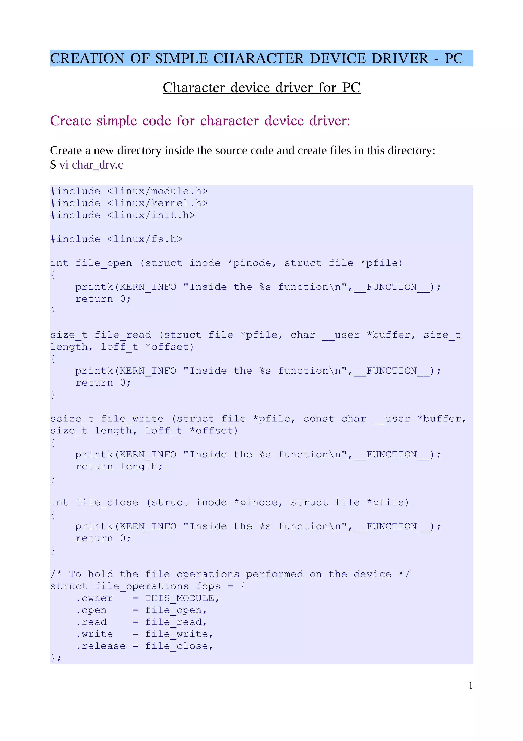 The document describes how to create a simple character device driver for Linux. It involves writing C code for file operations like open, read, write and close. The code is compiled into a kernel module which is loaded and tested. Key steps include creating files for the driver code, adding a Makefile, building the kernel object, loading the module, creating a device file, and verifying the file operations by reading kernel logs. The module can then be unloaded after testing is completed.