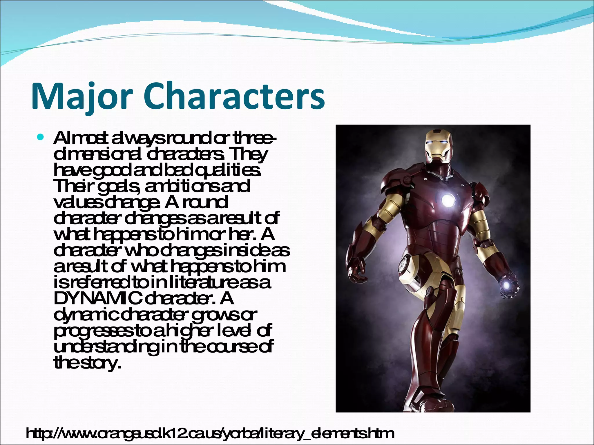 - Major and minor characters, with major characters being dynamic and changing internally over the course of a story, while minor characters are static.