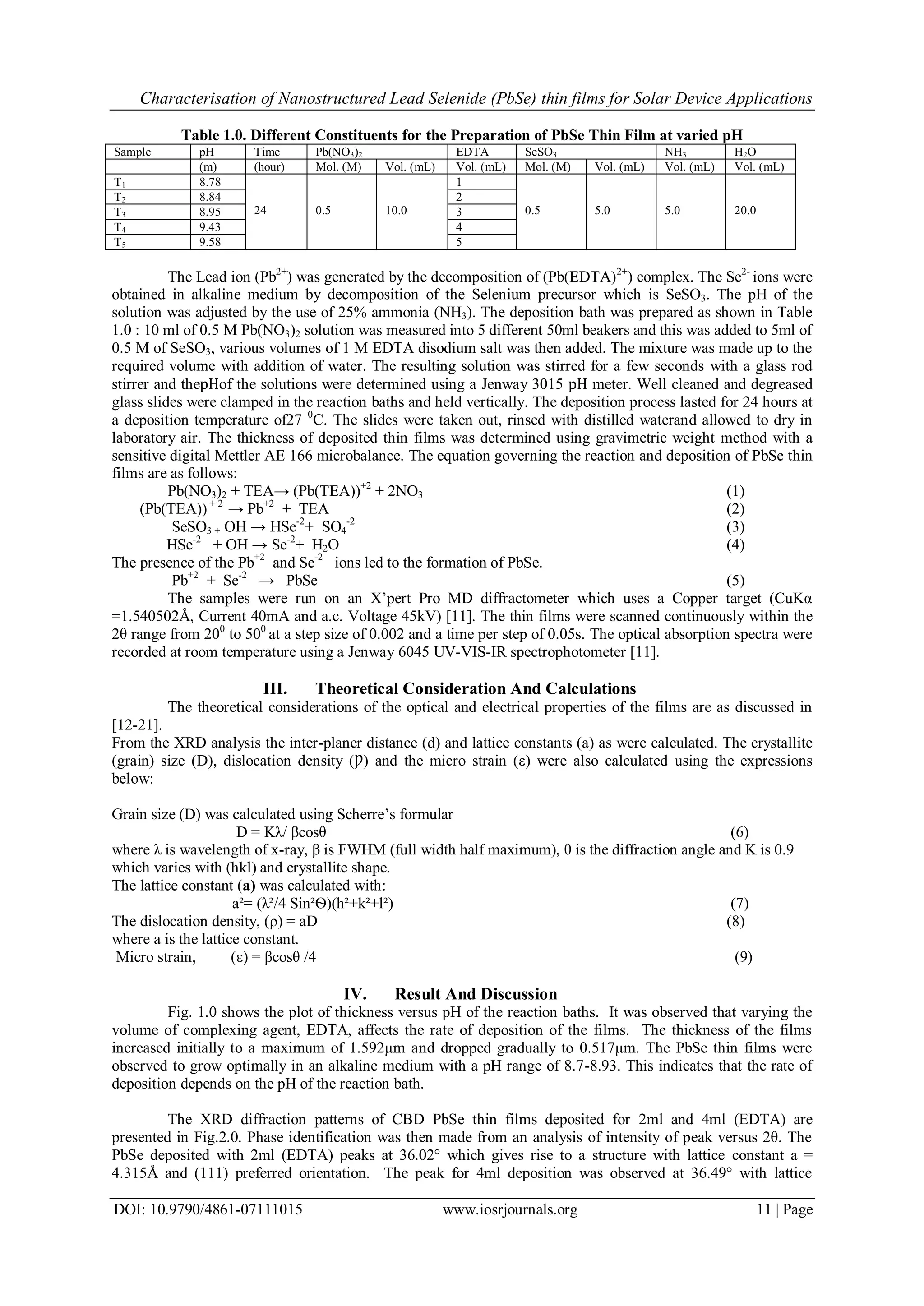 The document summarizes research characterizing nanostructured lead selenide (PbSe) thin films deposited using chemical bath deposition for potential solar device applications. PbSe thin films were deposited on glass substrates at varying pH levels of the deposition bath. Characterization of the structural, optical and electrical properties of the films showed that film thickness and properties like band gap energy and conductivity could be controlled by varying the deposition parameters like pH. Higher pH levels resulted in films with lower conductivity and band gap, indicating the properties of PbSe could be tuned for different functions. The nanostructured PbSe thin films showed potential for use in solar energy devices based on their optical absorption properties.