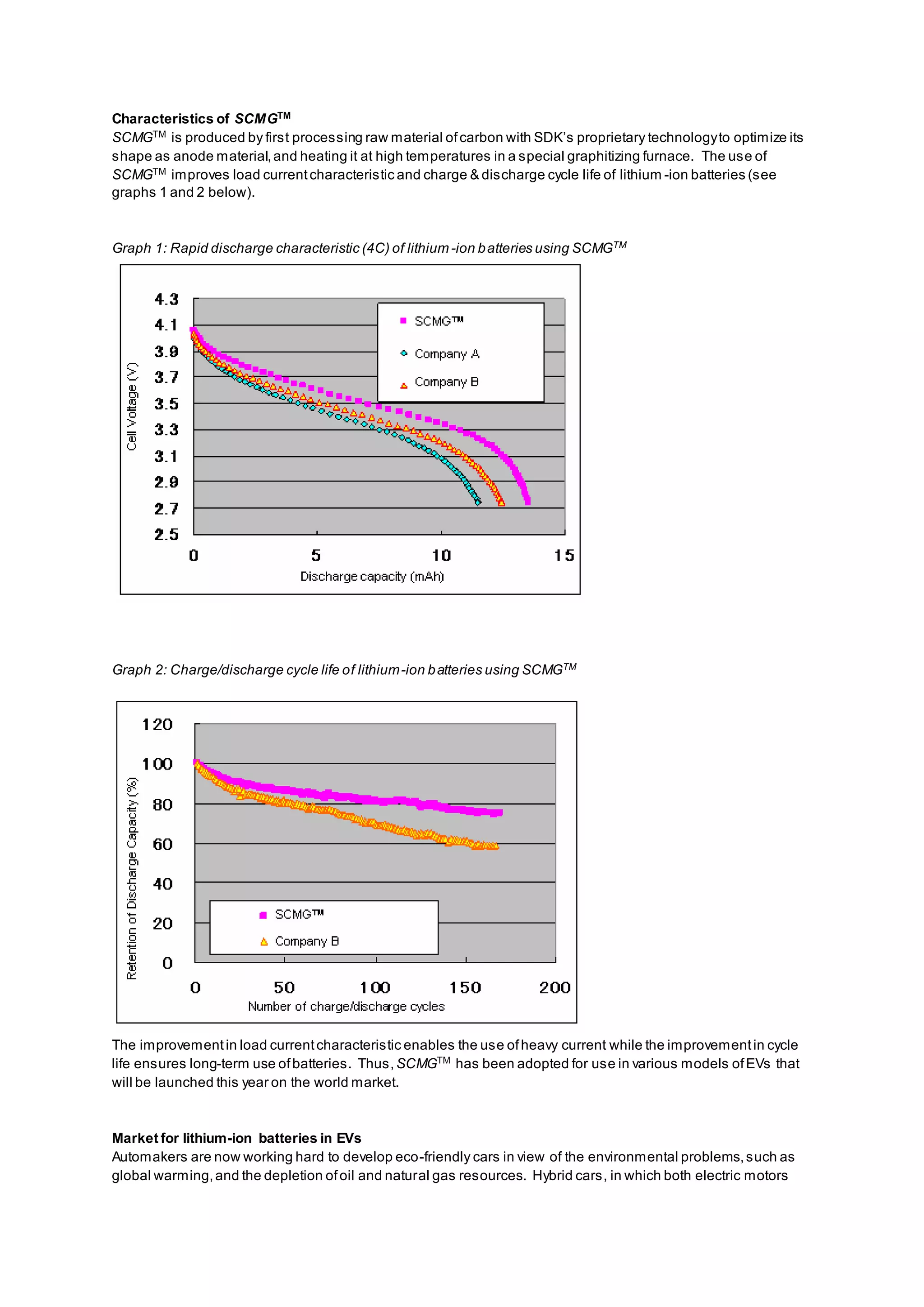 SCMGTM is a proprietary anode material for lithium-ion batteries produced by SDK. It is made through a process of shaping raw carbon material and heating it at high temperatures. Use of SCMGTM improves load current characteristics and battery cycle life, as shown in Graphs 1 and 2. This enables heavy current loads and long-term battery use. SCMGTM has been adopted for electric vehicles launching this year. SDK is expanding production capacity of SCMGTM to meet the growing demand for lithium-ion batteries in electric vehicles.