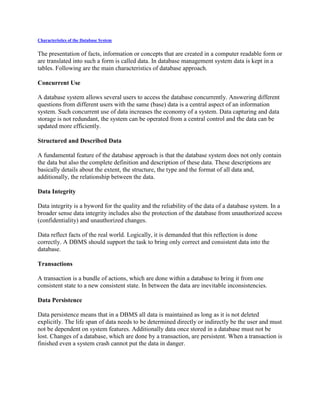 The document discusses the main characteristics of a database system. It notes that a database system allows concurrent use by multiple users to access and update shared data. It also structures and describes all stored data with details on structure, type and relationships. Additionally, it ensures data integrity by protecting data from unauthorized access or changes while only allowing correct and consistent data. Finally, it allows transactions to persistently change the database from one consistent state to another while ensuring data is not lost even if the system crashes.