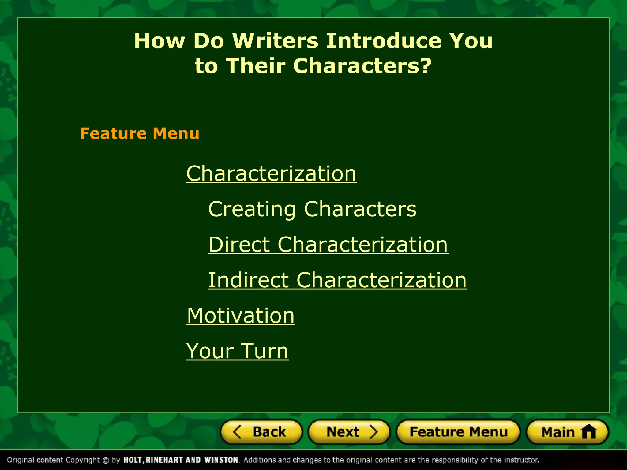 This document provides an overview of characterization techniques used by writers to introduce characters. It discusses direct characterization, where the writer tells about the character, and indirect characterization, where the writer shows the character through their actions, appearance, words, thoughts, feelings and relationships. Specific techniques of indirect characterization covered include using a character's appearance, actions, words, thoughts and feelings to reveal their personality and motivation. The document provides examples of each technique and prompts readers to analyze characters using these methods.