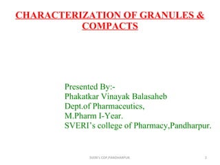 The document discusses characterization techniques for pharmaceutical granules and compacts. It describes methods for analyzing granule particle size, shape, density, moisture content, flow properties, and friability. It also covers techniques for evaluating tablet properties like weight variation, disintegration, dissolution, hardness and thickness. The purpose is to ensure granules and tablets meet specifications for content uniformity, drug release and stability.