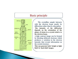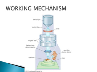 Scanning electron microscopy (SEM) is used to characterize nanoparticles by examining their morphology, crystalline structure, and composition. SEM works by scanning a beam of electrons across a sample, detecting signals from interactions between the electrons and the sample's atoms. This allows examination of a sample's topography, texture, size and shape of particles, elemental composition, and crystalline arrangement at high resolution down to 1-5 nm.