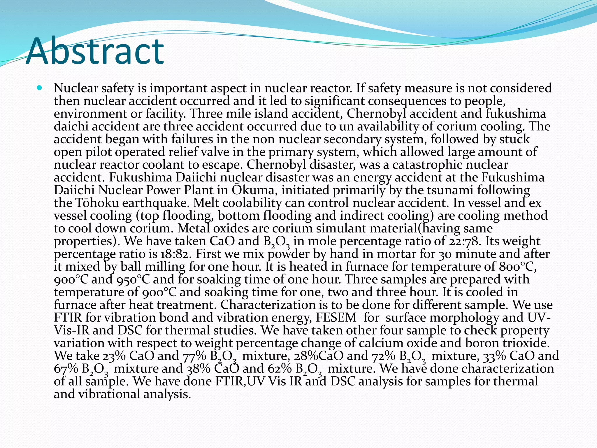 Experiments are carried out to analyze corium simulant materials. Calcium oxide and boron trioxide mixtures are used as simulants in varying weight percentages. The mixtures are ball milled and heat treated at different temperatures before characterization. Techniques like FTIR, UV-Vis-IR and DSC are used to analyze the samples' thermal and vibrational properties. Bottom flooding is found to be the most effective method for cooling corium, taking only a few minutes compared to hours for other methods. Decay heat is also found to delay cooling.