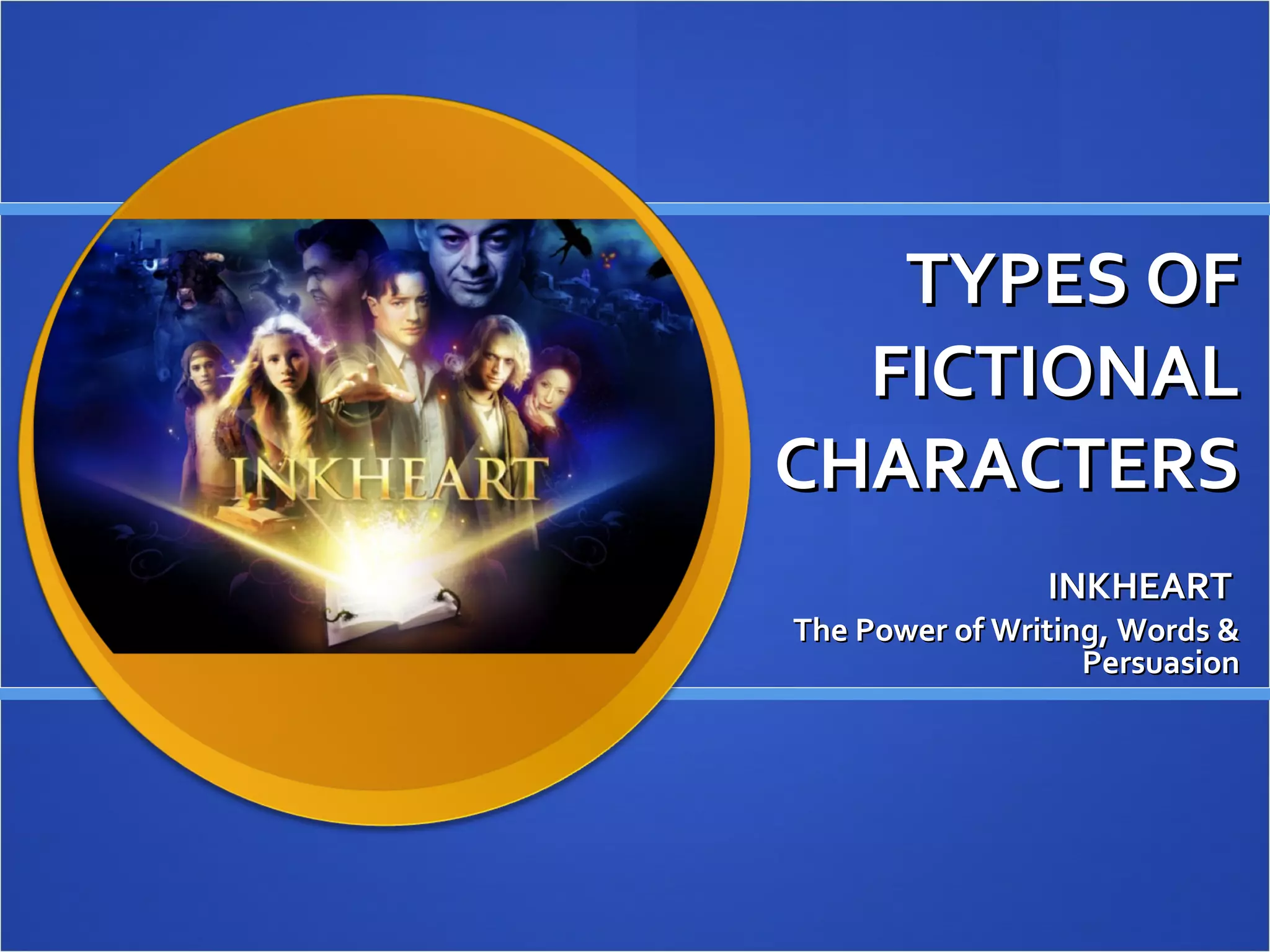 This document discusses different types of fictional characters that can appear in stories, including the main categories of round characters, flat characters, and stock characters. Round characters are complex and multidimensional, often serving as the protagonist or antagonist who drives the plot forward through their actions and experiences with conflict. Flat and stock characters tend to be minor supporting roles that are more stereotypical and whose actions have less direct impact on the overall story and its main characters. Specific examples of round characters from the story Inkheart are mentioned, including Meggie and Dustfinger, as well as the roles of protagonist and antagonist.