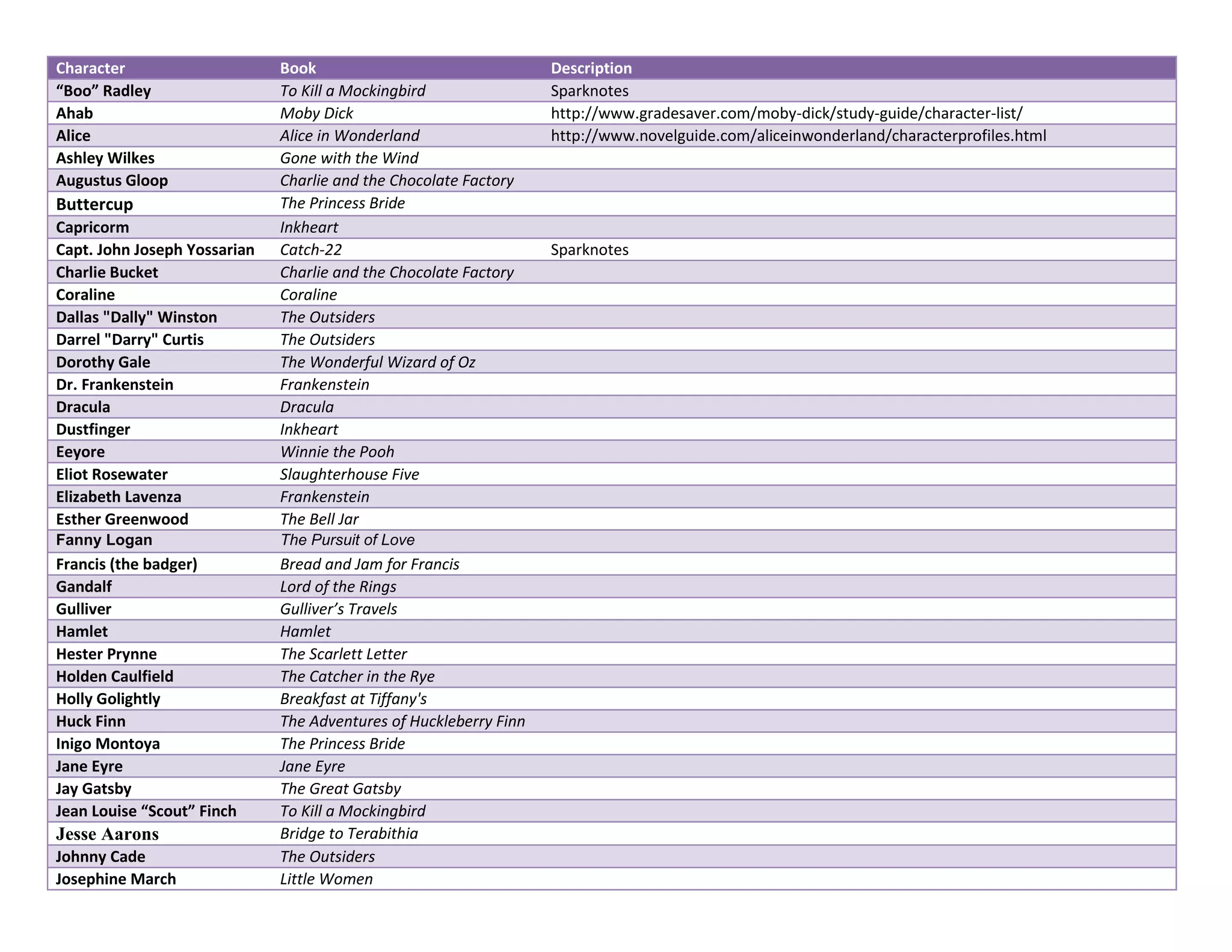 The document lists characters from classic novels along with the book they are from and in some cases a brief description or link to more information. Some of the notable characters included are Boo Radley from To Kill a Mockingbird, Ahab from Moby Dick, Alice from Alice in Wonderland, Ashley Wilkes from Gone with the Wind, Dorothy Gale from The Wizard of Oz, Dr. Frankenstein and The Monster from Frankenstein, Dracula from Dracula, Holden Caulfield from The Catcher in the Rye, Jay Gatsby from The Great Gatsby, Tarzan from Tarzan of the Apes, Willy Wonka from Charlie and the Chocolate Factory, and Frodo