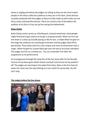 3) Rylan Clarke is a flamboyant entertainer who is memorable but lacks singing ability. The judges see him as more of a novelty act.